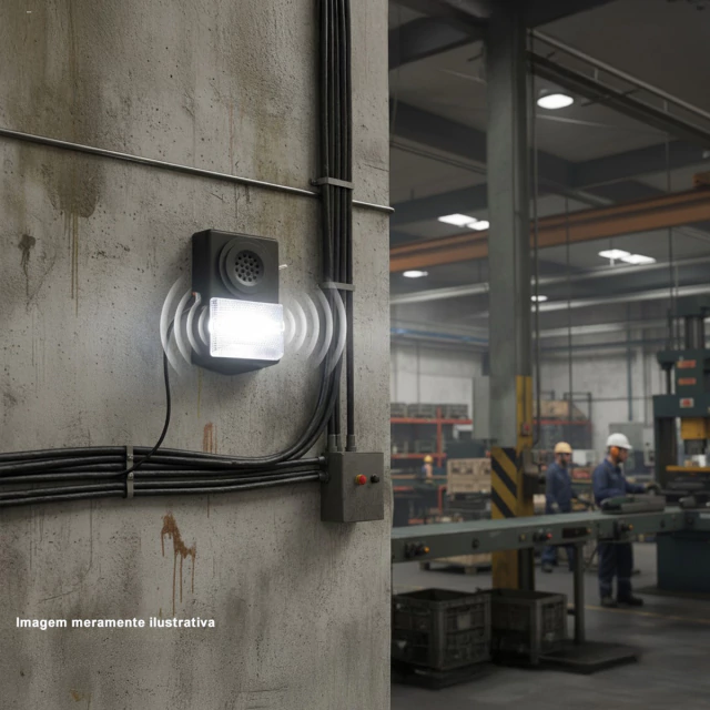 Alto alcance sonoro e visual: volume de até 119 dBA (±3 dBA) com toque padrão de telefone e sinal luminoso de ~100 lúmens, garantindo alerta claro mesmo nos locais mais ruidosos