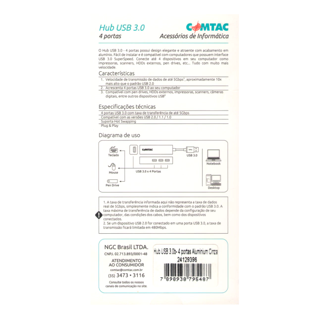 Alta Velocidade: Equipado com quatro portas USB 3.0, proporciona taxas de transferência de até 5 Gbps, garantindo rapidez na transmissão de arquivos.