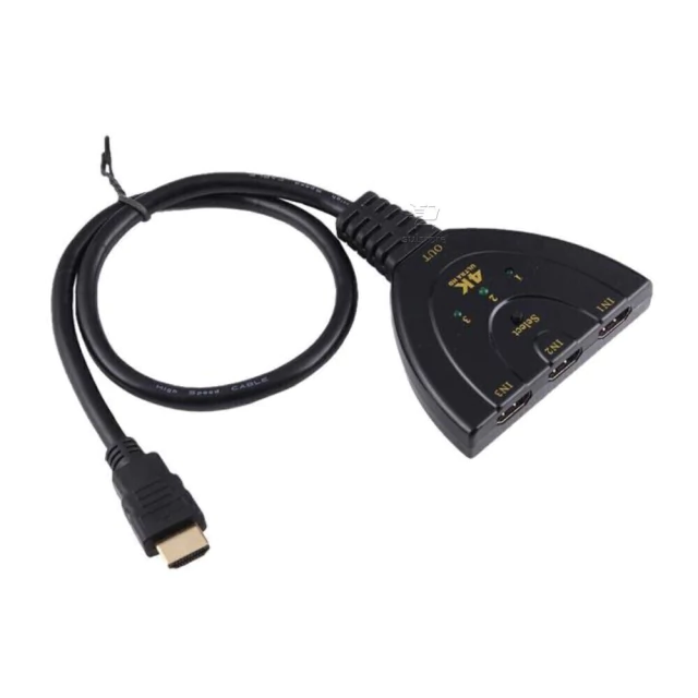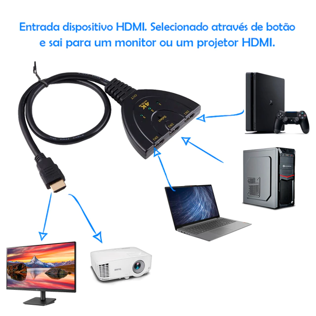 Possui 3 entradas HDMI e 1 saída, onde você pode ir chaveando (trocando) a imagem de 3 periféricos utilizando apenas 1 monitor / TV