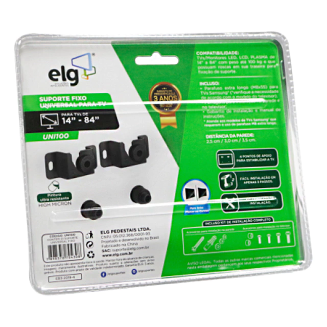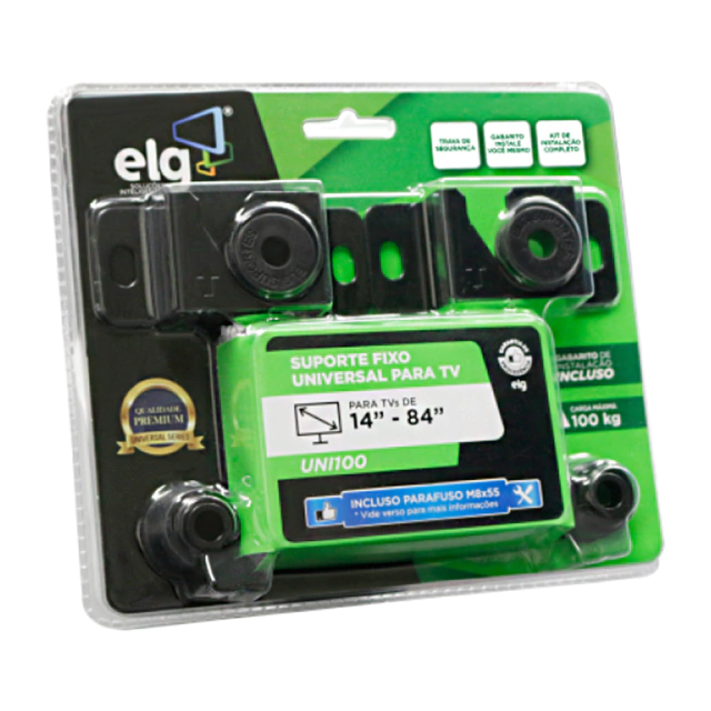 - Indicado para TVs, monitores LDC, LED, plasma, 3D de 14" a 84" com até 100Kg e compatíveis com padrão de fixação 100x100 a 800x400 (HxV).